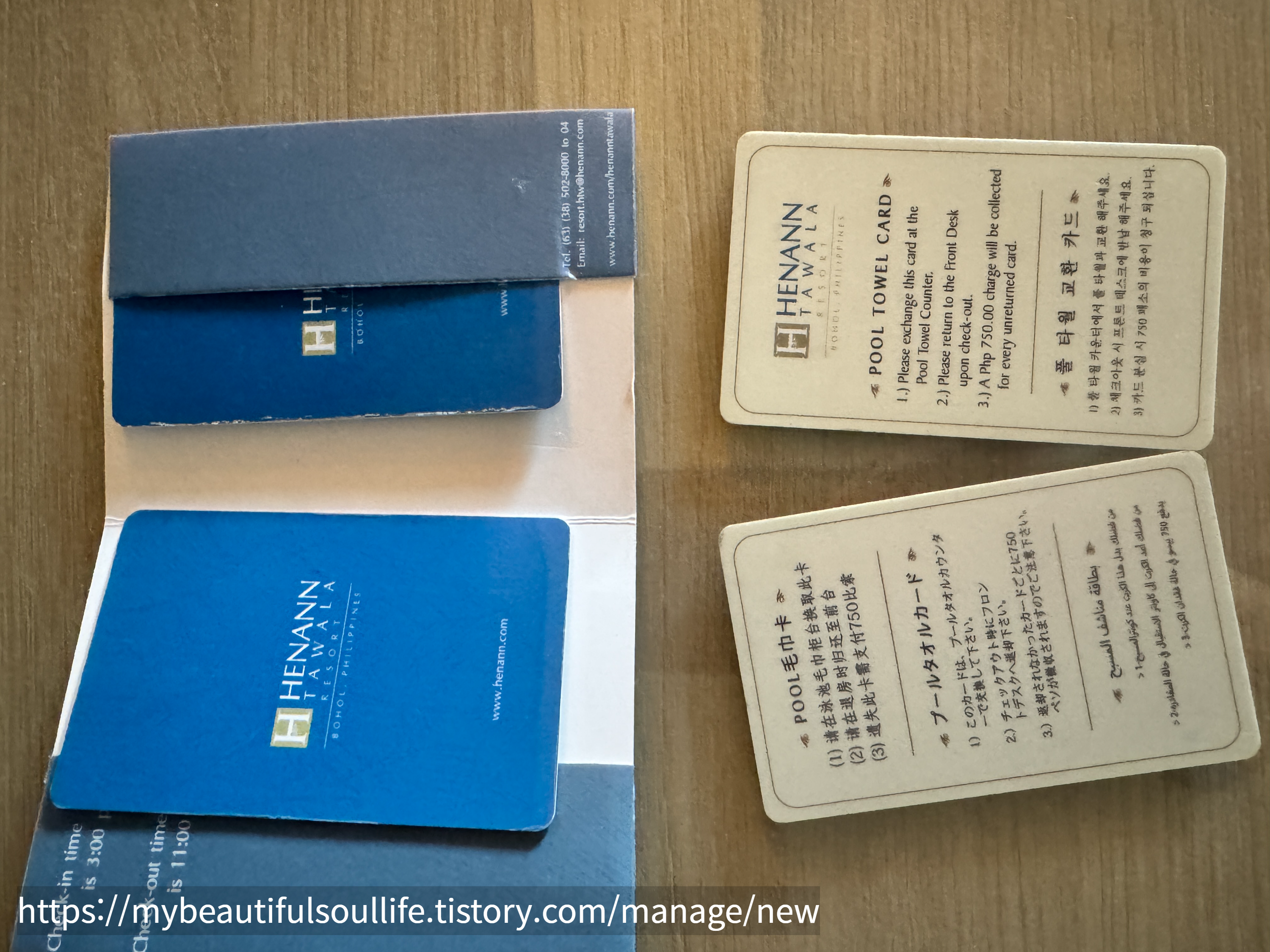 베이지색 카드 2개는 수영장에서 타올 빌릴때 사용해요.