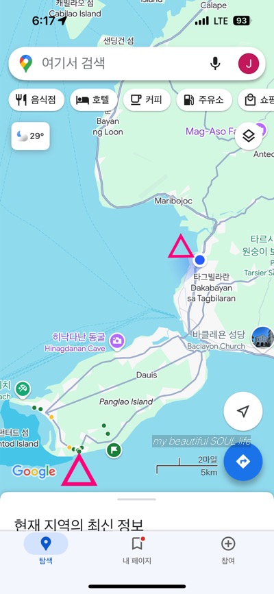 구글 맵을 보니 밑에 있는 세모 지점에서부터 타그빌라란까지 왔네요.