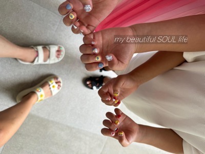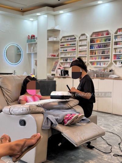 5살과 8살 아이들은 네일을 하기로 했고, 어른 2명은 페디를 하기로 했어요.