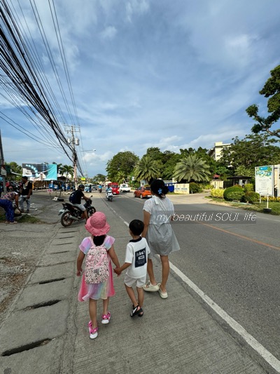 오토바이와 차 조심 시키면서 쭉 걸어가다 보니