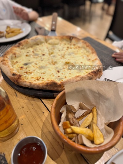 화덕 피자를 구워주는 곳인데, 피자 맛이 여러 종류가 있고, 피자 맛 반씩 주문도 가능합니다.