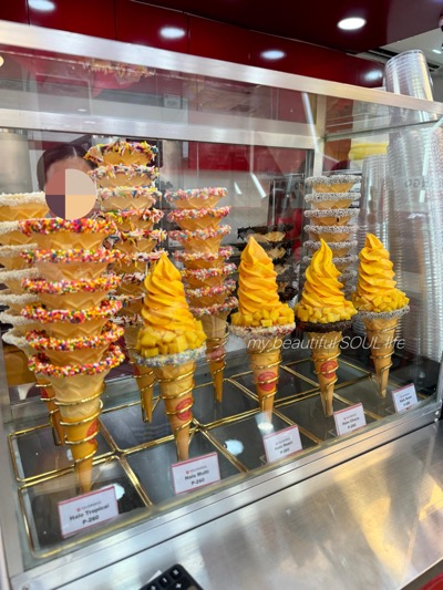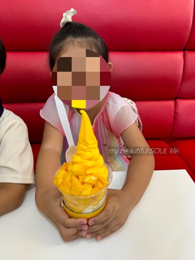 아이들이 먹고 싶어 하는 망고 아이스크림 콘 2개와, 망고만 잘라서 주는 컵 하나 시키고, 어른들이 먹을 망고 아이스크림도 시킵니다. 앉아서 기다리고 있으니까 가져다주더라고요. 한입 베어무니 진한 망고맛이 확 느껴져서 좋더라고요.
